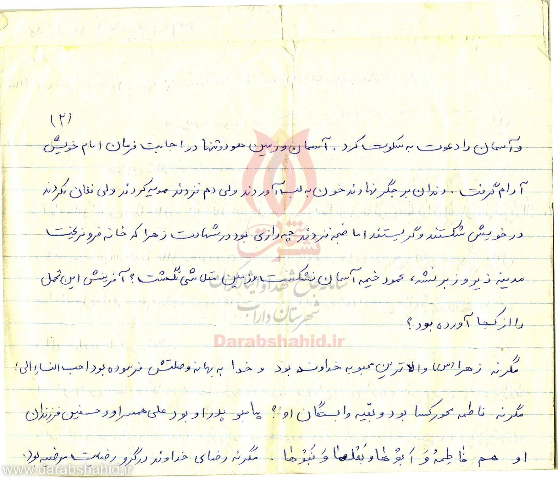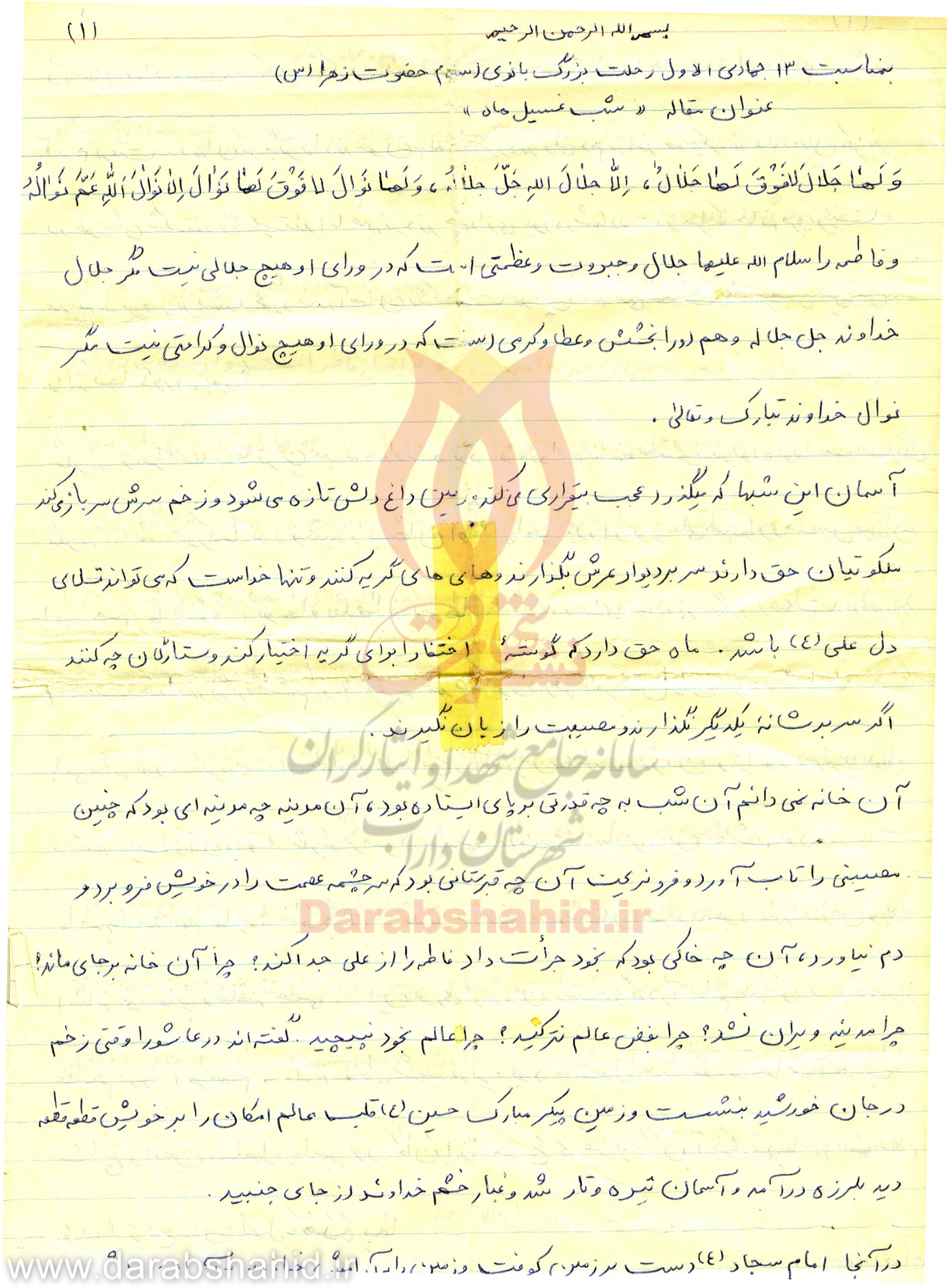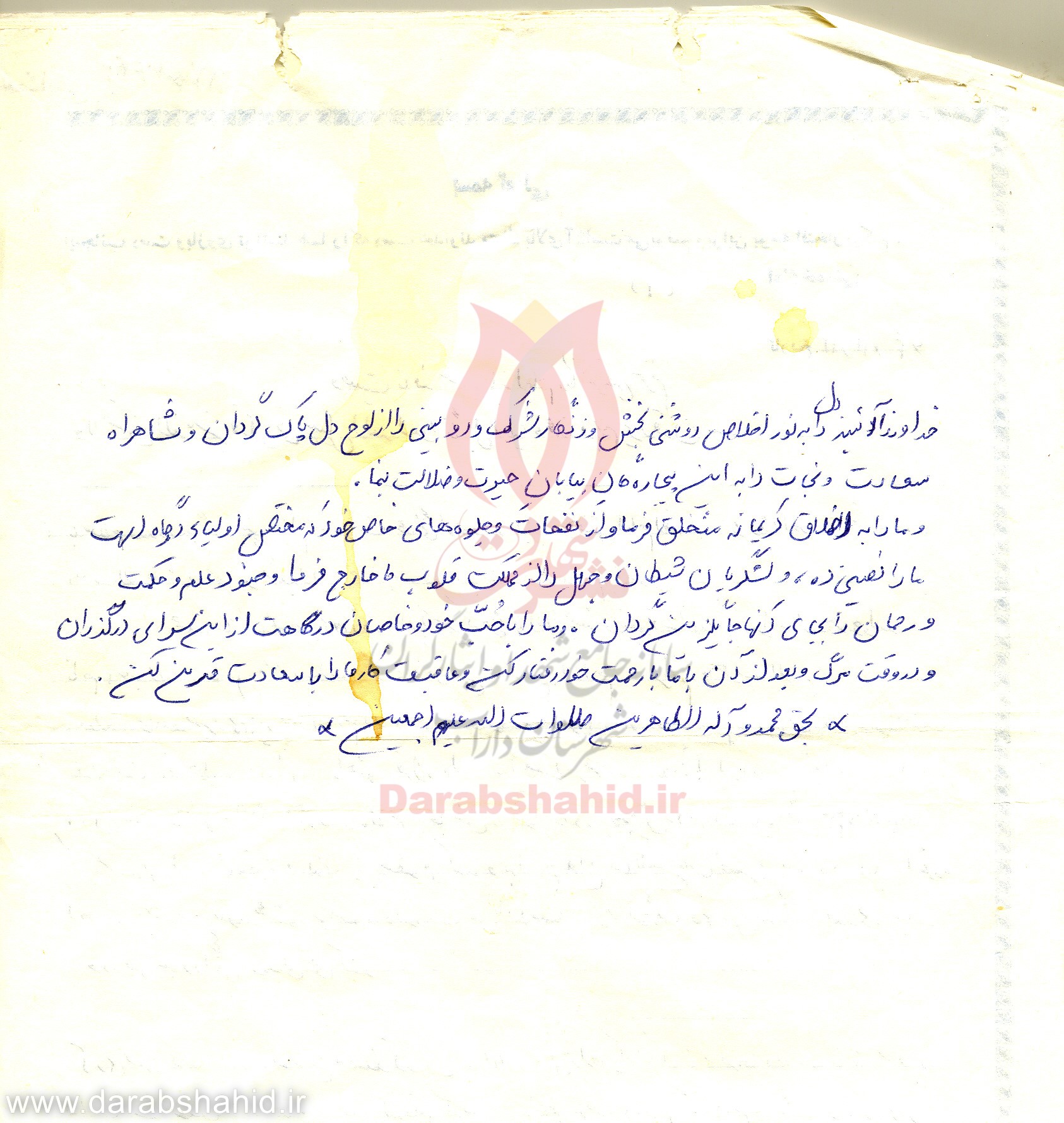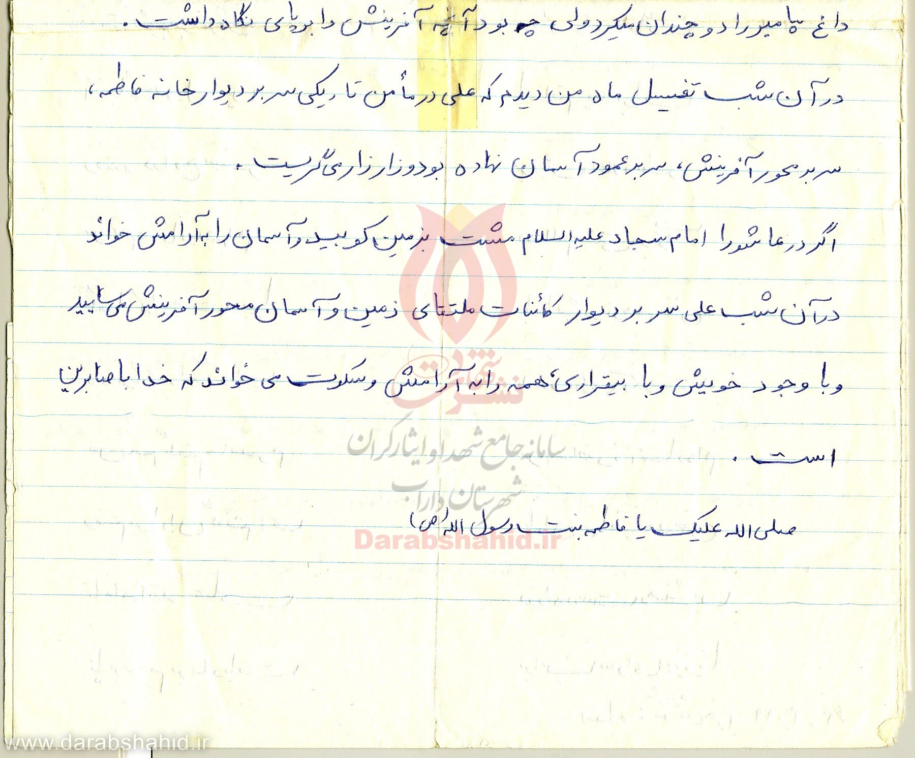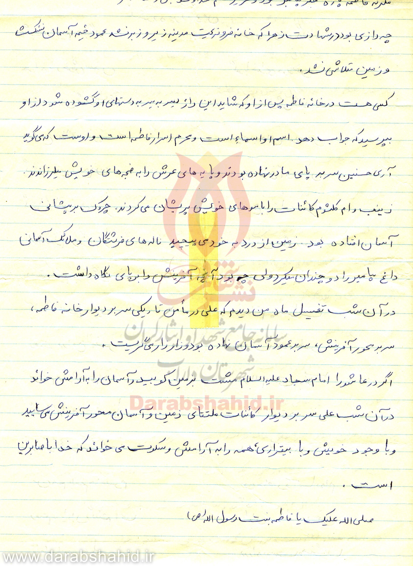 مادرجان؛ ناراحت نباشید، می دانم که در مرگم ناله و شیون می کنید، ولی صبر را پیشه خود کنید و با برادرم و خواهرانم مانند همان روزهای اول رفتار کن، تا احساس ناراحتی و تنهایی نکنند.