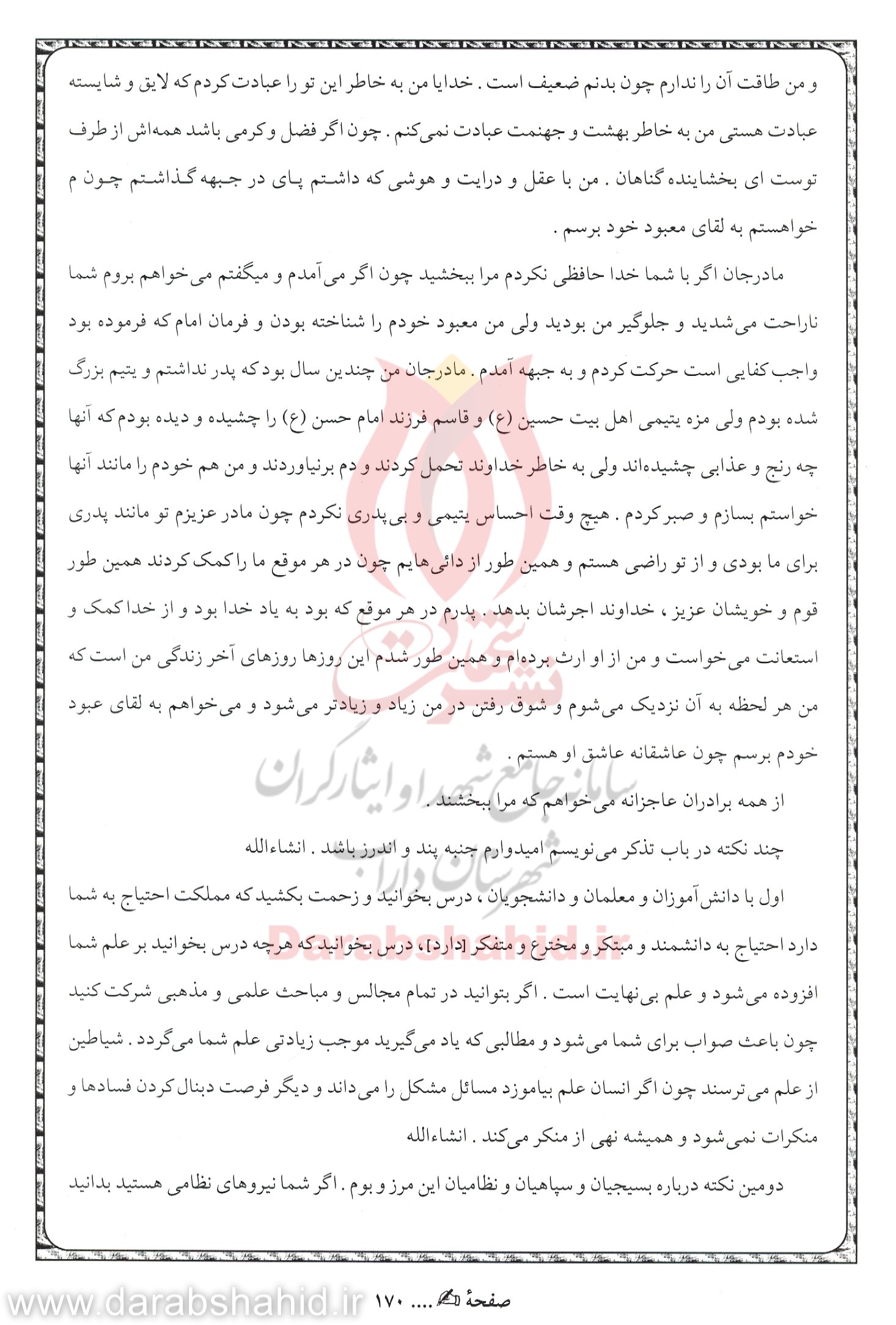 مادرجان؛ من چندین سال بود که پدر نداشتم و یتیم بزرگ شده بودم. ولی مزه یتیمی اهل بیت حسین(ع) و قاسم فرزند امام حسن(ع) را چشیدم و دیدم که آنها چه رنج و عذابی کشیدند. ولی به خاطر خداوند تحمل کردند و دم بر نیاوردند و من هم خواستم، خودم را مانند آنها بسازم و صبر کردم، هیچ وقت احساس یتیمی و بی پدری نکردم. چون مادر عزیزم! تو برای ما مانند پدر بودی و از تو راضی هستم و همین طور از دایی هایم، چون در هر موقع ما را کمک می کردند، همین طور اقوام و خویشان عزیز، خداوند اجرشان بدهد.