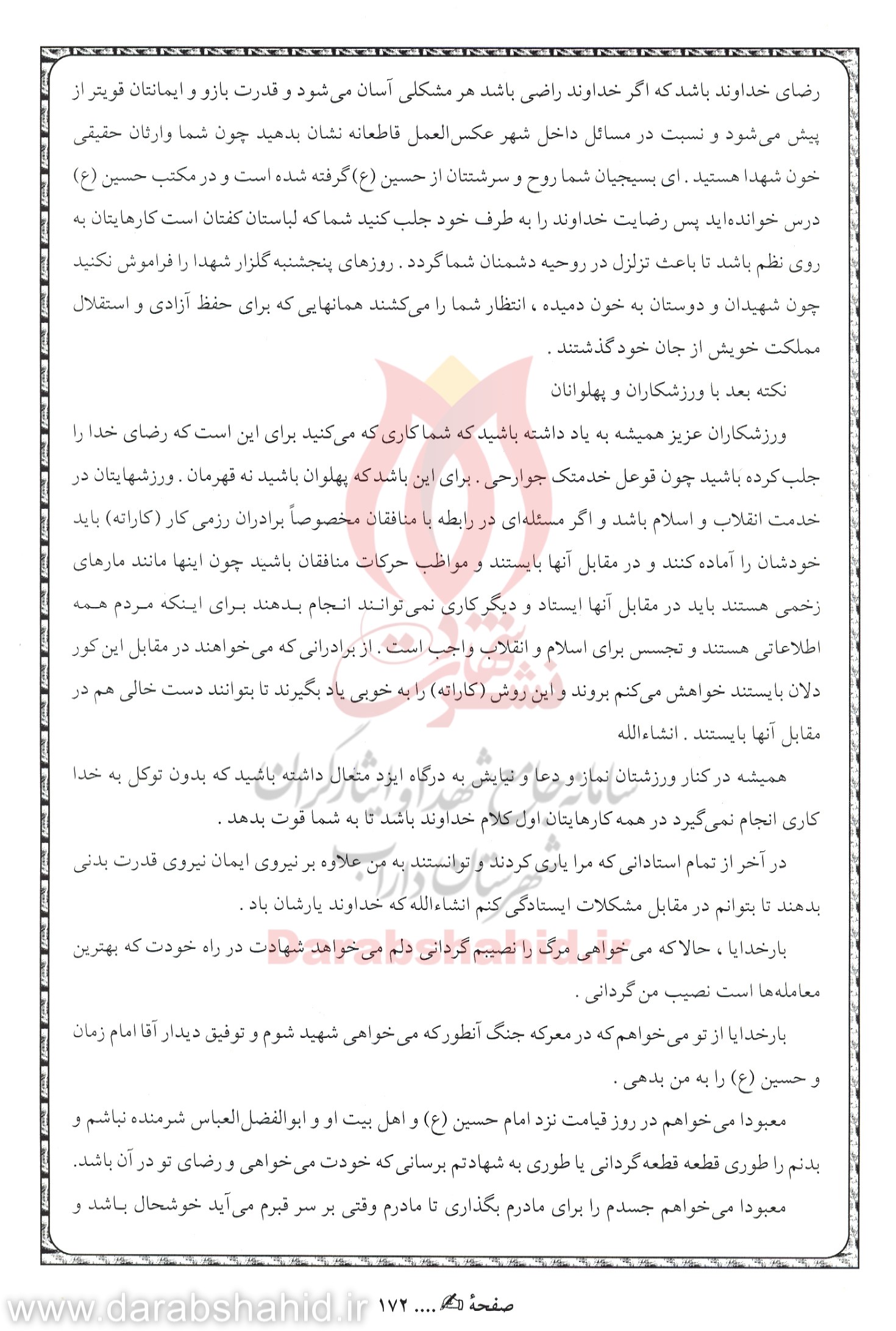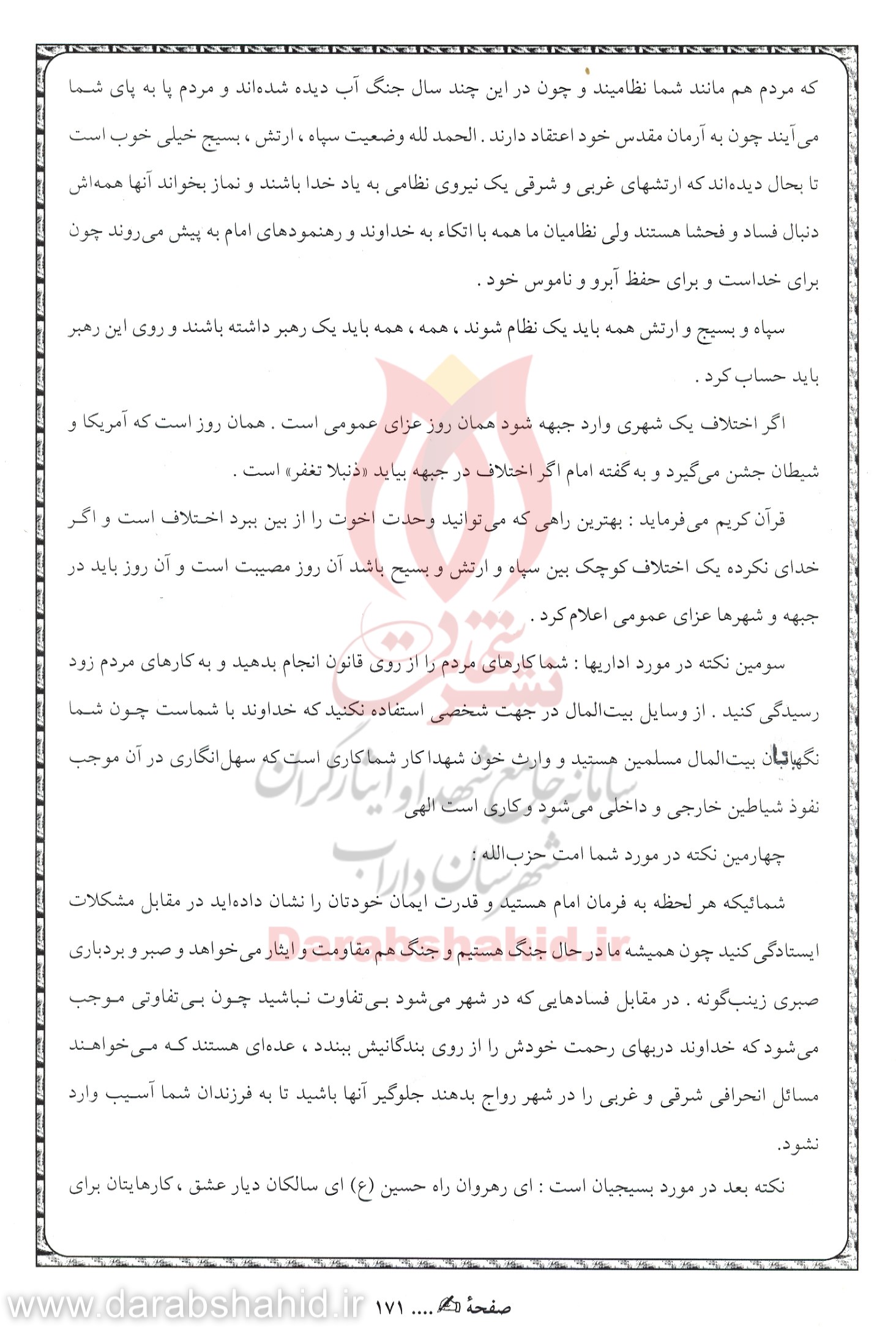نکته بعد در مورد بسیجیان است: ای رهروان راه حسین (ع)، ای سالکان دیار عشق؛ کارهایتان برای رضای خداوند باشد، که اگر خداوند راضی باشد هر مشکلی آسان می شود و قدرت بازو و ایمانتان قوی تر از پیش می شود و نسبت در مسایل داخل شهر عکس العمل قاطعانه نشان بدهید. چون شما وارثان حقیقی خون شهدا هستید. ای بسیجیان؛ شما روح و سرشتتان از حسین(ع) گرفته شده است و در مکتب حسین(ع) درس خوانده اید، پس رضایت خداوند را به طرف خود جلب کنید. شما که لباستان کفنتان است، کارهایتان به روی نظم باشد، تا باعث تزلزل در روحیه دشمنان شما گردد. روزهای پنج شنبه گلزار شهدا را فراموش نکنید، چون شهیدان و دوستان به خون آرمیده، انتظار شما را می کشند. همانهایی که برای حفظ آزادی و استقلال مملکت خویش از جان خود گذشتند.